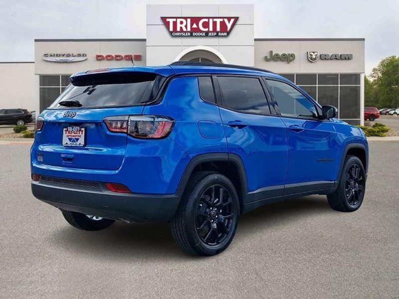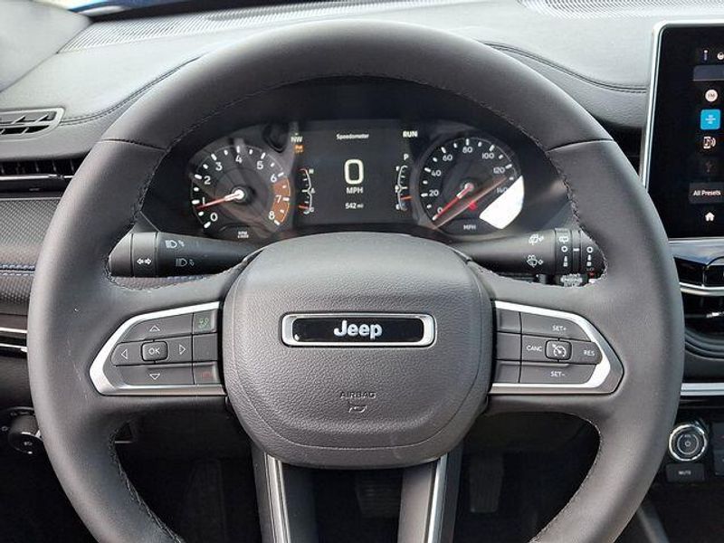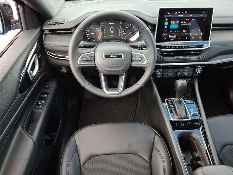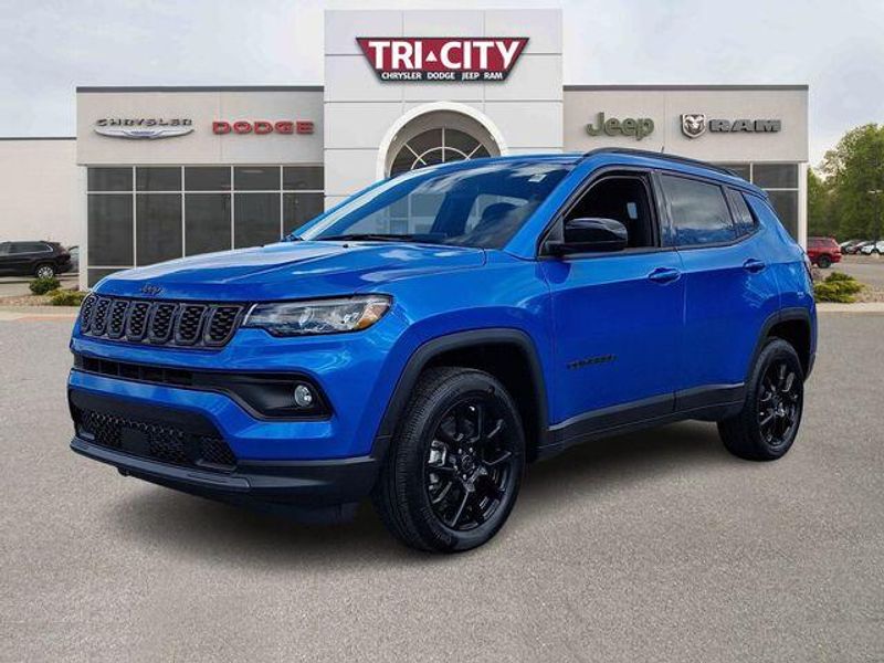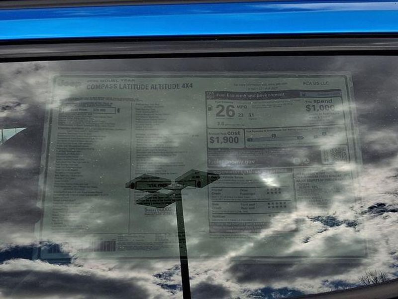 Hydro Blue Pearlcoat 2026 Jeep Compass Latitude 4WD 8-Speed Automatic 2.0L I4 DOHC Compass Latitude, 2.0L I4 DOHC, 8-Speed Automatic, 4WD, Hydro Blue Pearlcoat, Black Cloth, 10.1'' Touchscreen Display, 4-Wheel Disc Brakes, 6 Speakers, Air Conditioning, Altitude Special Edition, AM/FM radio: SiriusXM, Automatic temperature control, Black Day Light Opening Moldings, Bluetooth Handsfree Phone and Audio, Brake assist, Compass, Delay-off headlights, Driver vanity mirror, Dual front impact airbags, Dual front side impact airbags, Electronic Stability Control, Front Bucket Seats, Fully automatic headlights, Global Telematics Box Module, Gloss Black Surround/Neutral Gray Rings, Heated door mirrors, Heated front seats, Heated steering wheel, Knee airbag, Leather Shift Knob, Leather steering wheel, Low tire pressure warning, Neutral Gray Exterior Badging, Occupant sensing airbag, Outside temperature display, Overhead airbag, Panic alarm, ParkView Rear Back-Up Camera, Passenger door bin, Passenger vanity mirror, Piano Black Interior Accents, Power steering, Power windows, Quick Order Package 29N Altitude, Radio: Uconnect 5 with 8.4'' Display, Rear window defroster, Security system, SiriusXM Satellite Radio, Sliding Sun Visors with Illuminated Mirrors, Speed control, Split folding rear seat, Steering wheel mounted audio controls, Telescoping steering wheel, Tilt steering wheel, Traction control, Variably intermittent wipers, Wheels: 18'' x 7'' Gloss Black Painted Aluminum.